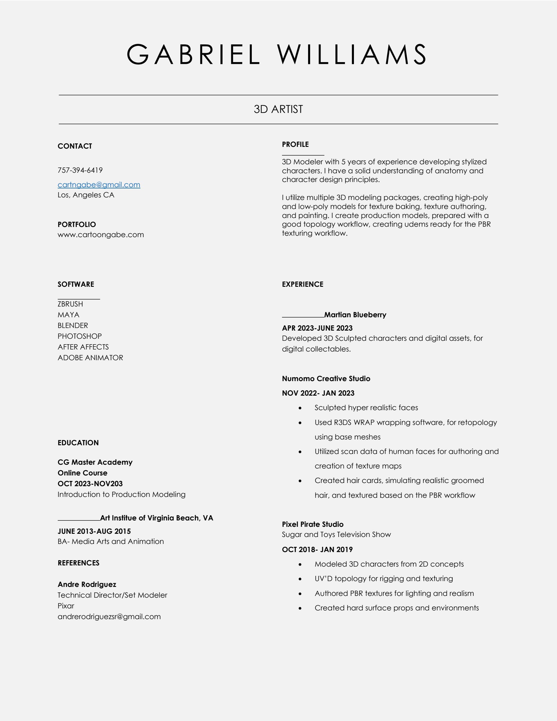 Hello my name is Gabriel! A 3D artist from the 757, in Los Angeles CA. I have a passion for transforming 2d concepts and designs into 3D assets, and building stories and motion, that moves people.